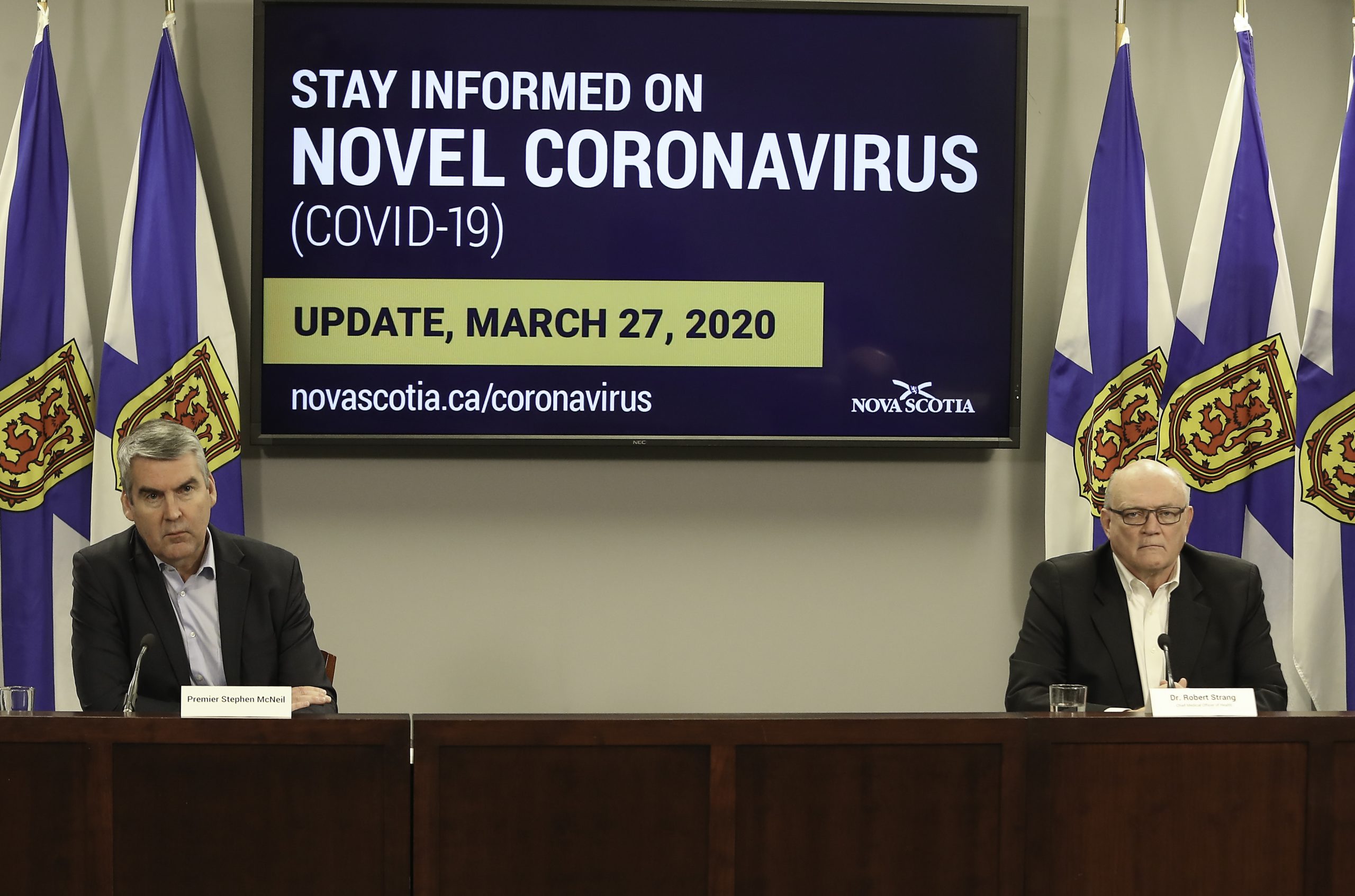 2020年3月27日星期五,史蒂芬·麦克尼尔总理(左)和罗伯特·斯特朗博士在每日新闻发布会上。图片:通信新斯科舍省。