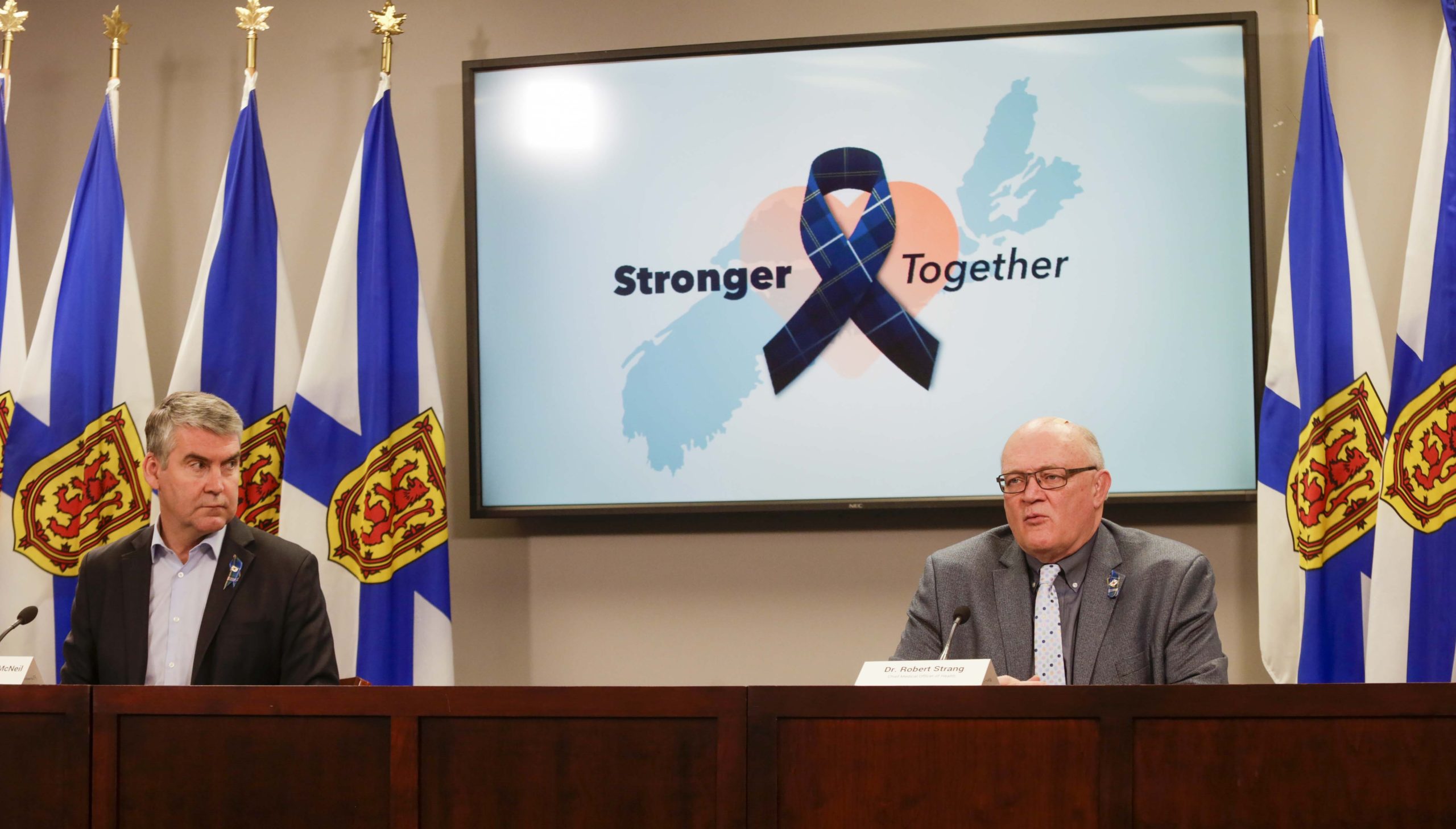 2020年4月28日,星期二,国务院总理斯蒂芬·麦克尼尔(左)和卫生首席医疗官罗伯特·斯特朗在COVID-19疫情通报会上。图片:通信新斯科舍省。