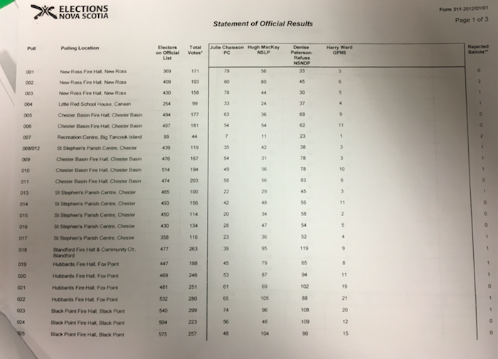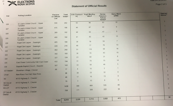 Chester–St. Margaret’s was one of the closest ridings in the election. At the end of the evening, precinct vote counts gave Peterson-Rafuse the edge by 46 votes, 2,800 to 2,754. But then the votes cast out of district gave MacKay the victory.