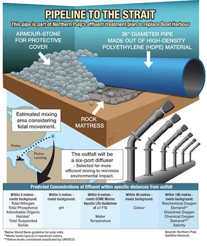 的emails the Halifax Examiner obtained through the freedom of information request also showed that in September 2017 Northern Pulp received Stantec’s “receiving water study” — the one that models how the treated effluent is expected to mix with the water in the Northumberland Strait, which will be used to help set the “end of pipe” limits. Bizarrely, according to Matheson, the government could not provide me (or the public) with the document until the project has been registered.