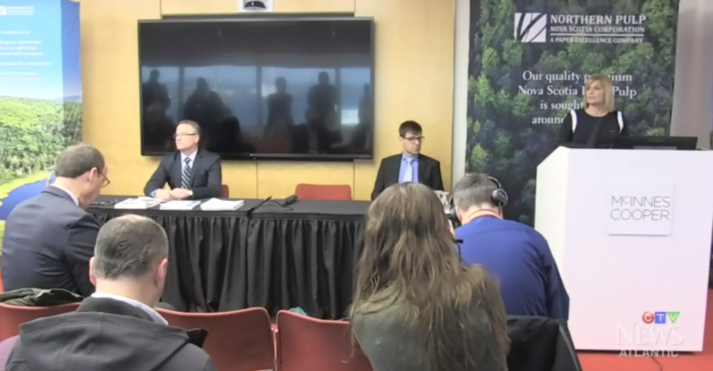 屏幕截图来自CTV电视报道北部纸浆在哈利法克斯的新闻发布会。新斯科舍北方纸浆公司总经理布鲁斯·查普曼(左),卓越纸业公司首席执行官运营东部副总裁让·弗朗索瓦·吉约(C),凯西·克劳蒂尔(右)