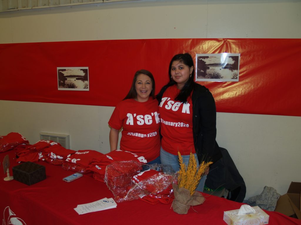 PLFN青年委员会主席Shyanna Denny(左)和PLFN乐队委员Haley Bernard(右)在关闭港口的倒计时庆祝活动上分发A 'se 'K t恤。