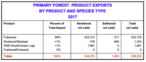 当您查看2017年注册表中报告的出口时(如下表所示),它们都在Pulpwood,Studwood / Sawlogs或OSB木材/胶合器日志的产品类别中。因此,例如,2017年出口的98.6%的主要森林产品被收购为Pulpwood。52016年,出口的初级林产品中有16%是作为薪材和能源材获得的,用于生产能源的设施或用于非住宅建筑供暖。但在2017年,这类产品似乎发生了一些奇怪的事情。显然,这些出口都不是作为薪材或能源木材(生物量)获得的。