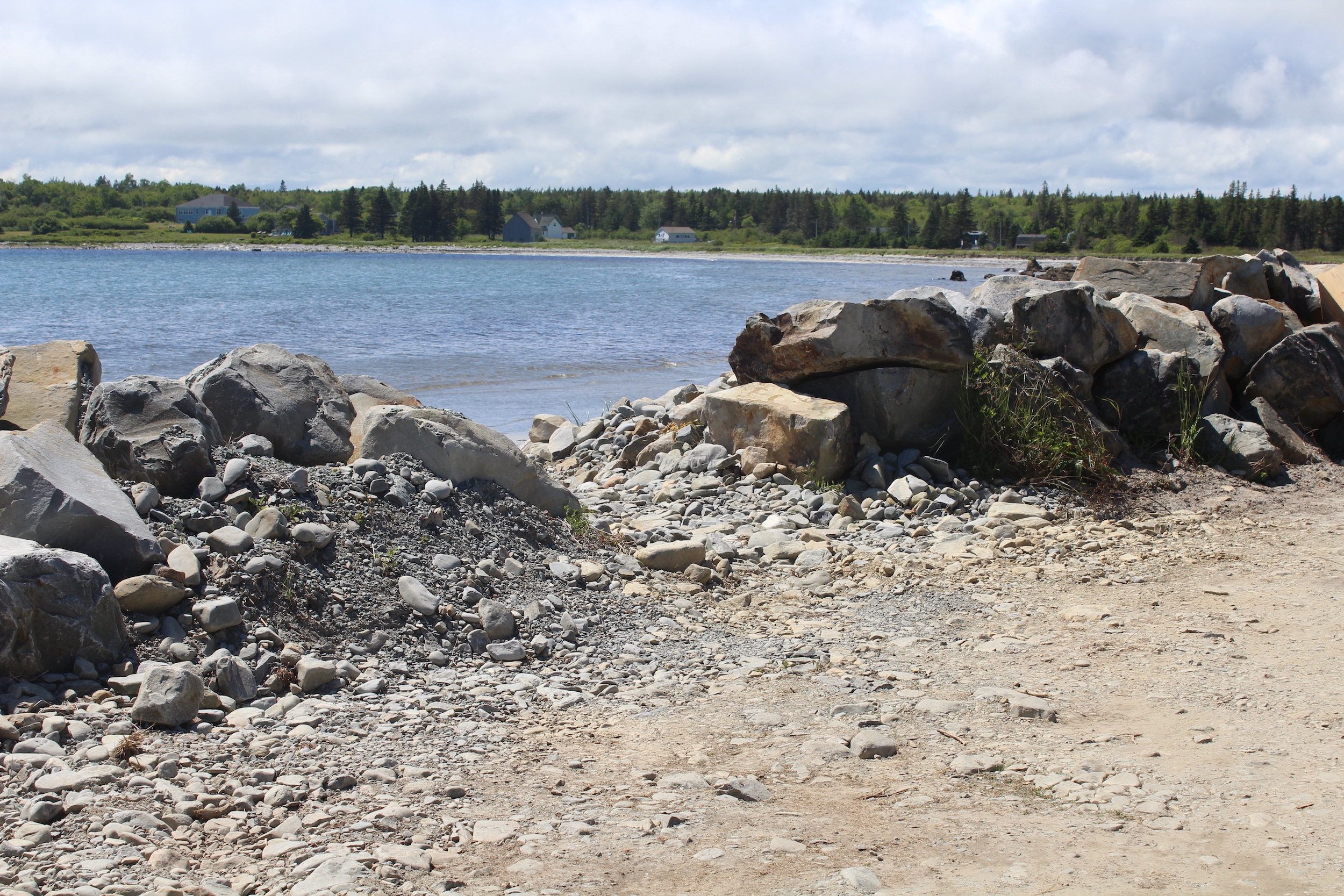 A hole has been punched through the riprap protecting Eagle Head Beach Road from storm surges. Photo: Tim Bousquet / Halifax Examiner