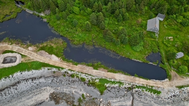 A drone photo of the extension of Eagle Head Beach Road onto Kelly’s property shows (at far right) that the pond was partially filled to construct the road. Photo contributed