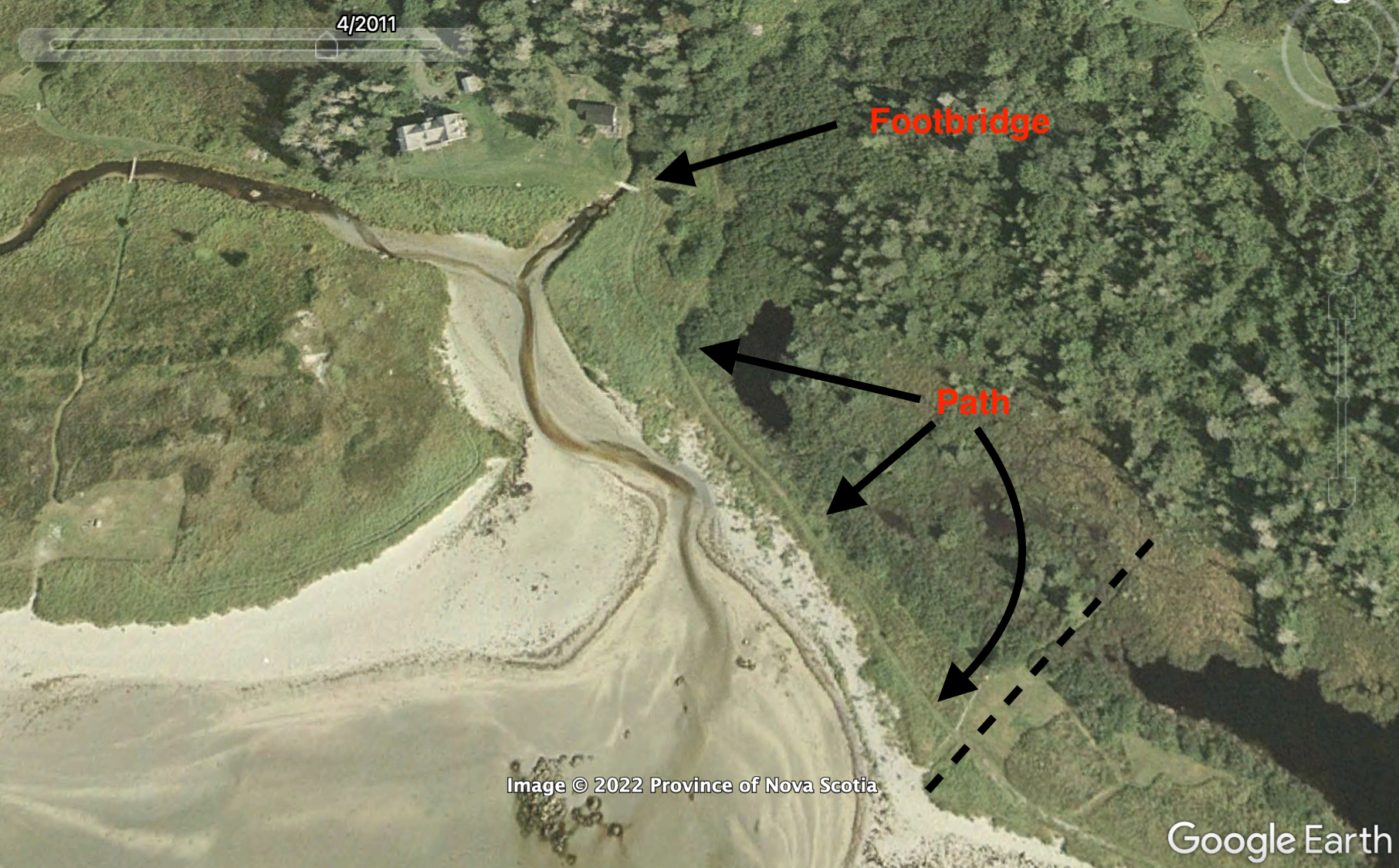 Mourre took me to what he called Schoolhouse Road, named after a one-room schoolhouse that served the community until 1959. (The structure burned down in 2000.) Mourre said that when the school was operating, the province constructed a footbridge over the brook so that children who lived to the south and east could get to school via the path that led from Eagle Beach Road, through what is now Kelly’s property.
