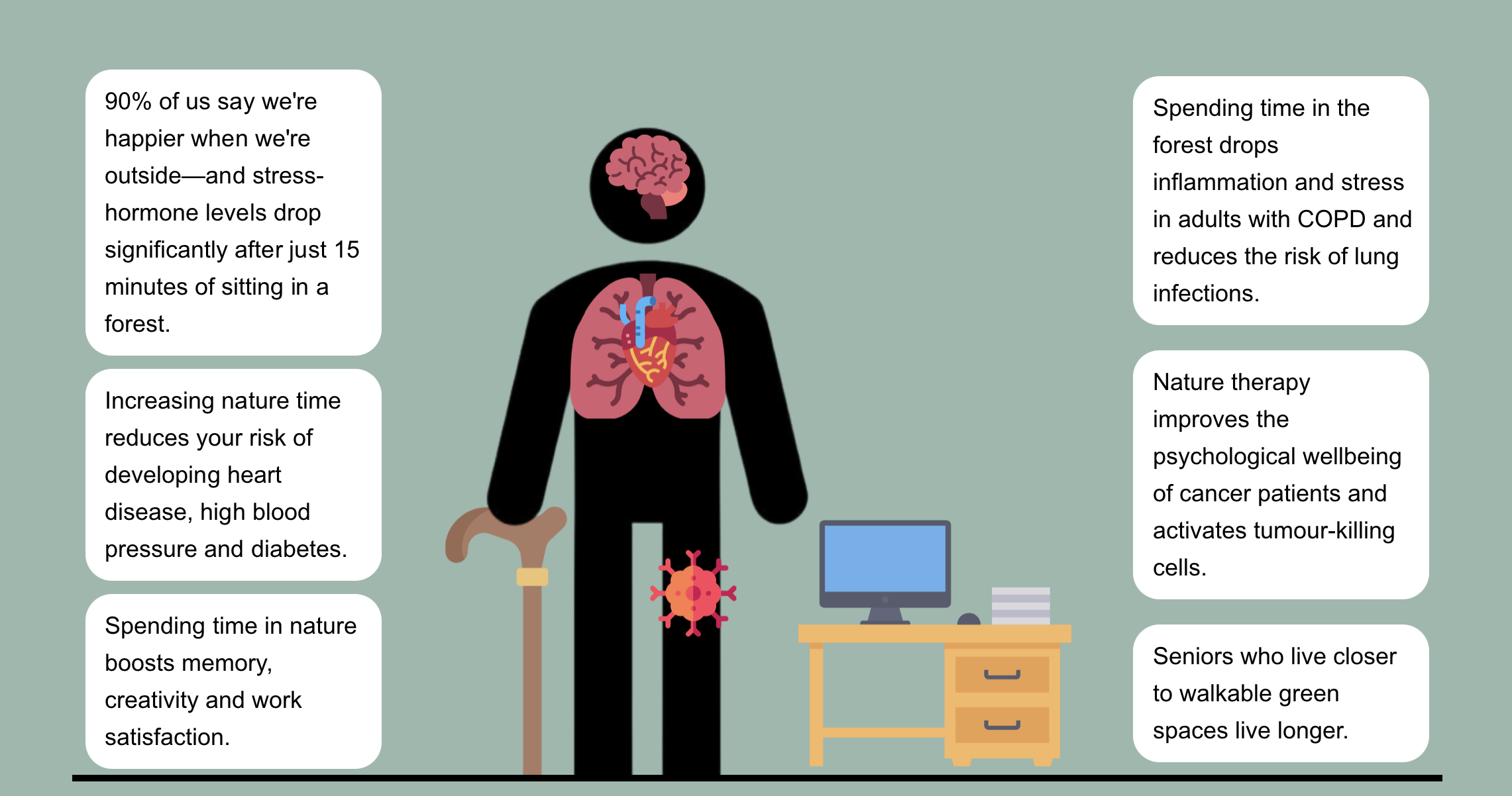 From walking on a trail to digging in a garden, swimming in a lake, or simply sitting on a park bench, evidence shows connecting with nature increases energy, creativity and concentration, and reduces stress, anxiety, and chronic pain.