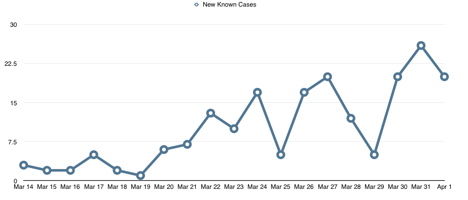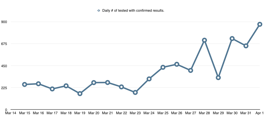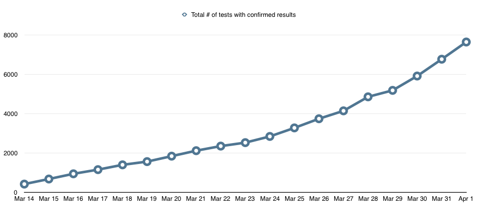 这仍然有些令人困惑,因为斯特朗博士说,他们现在只需四个小时就能得到结果。但由于该部门没有公布任何一天进行的所有检测的确切数字,我仍然使用正+负的结果数字,并称之为“有确认结果的检测”。据推测,有待结果的测试将在未来几天的数据中得到反映。