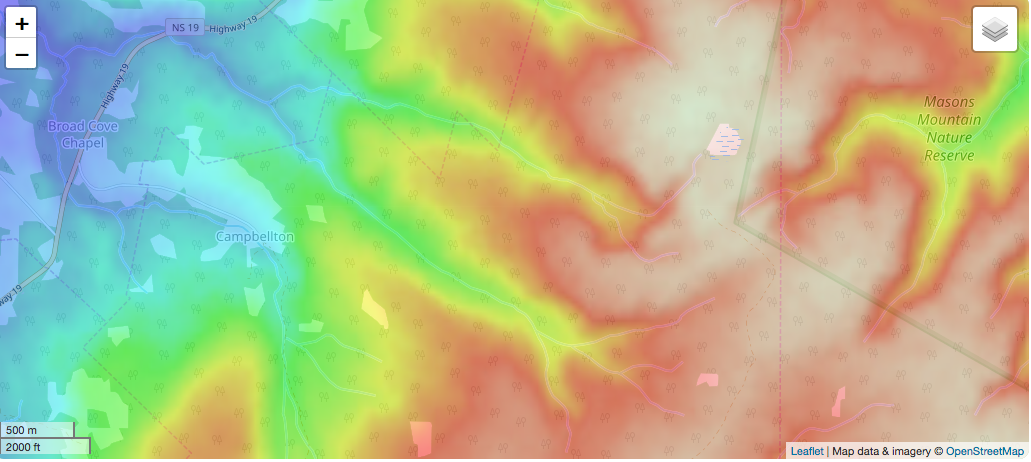 一张地形图显示了坎贝尔顿与梅森山自然保护区的距离。来源:https://en-ca.topographic-map.com/maps/qui/Nova-Scotia/