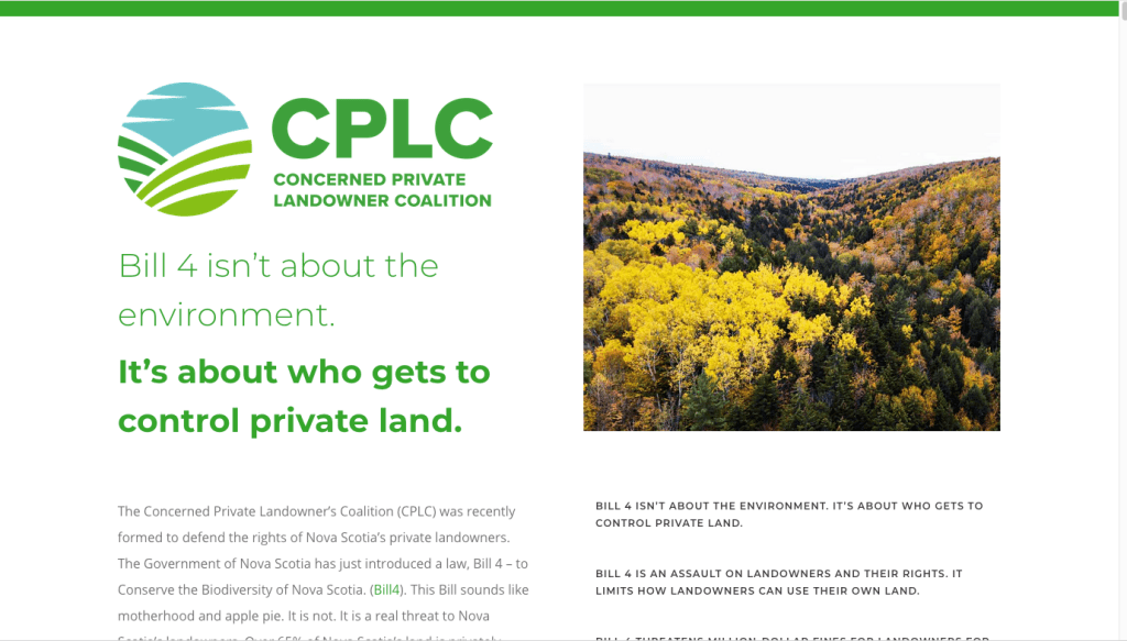 该联盟的脸书主页称:“我们代表的是农民、林地所有者、住房和小屋开发商以及数千名自豪的新斯科舍省土地所有者。”