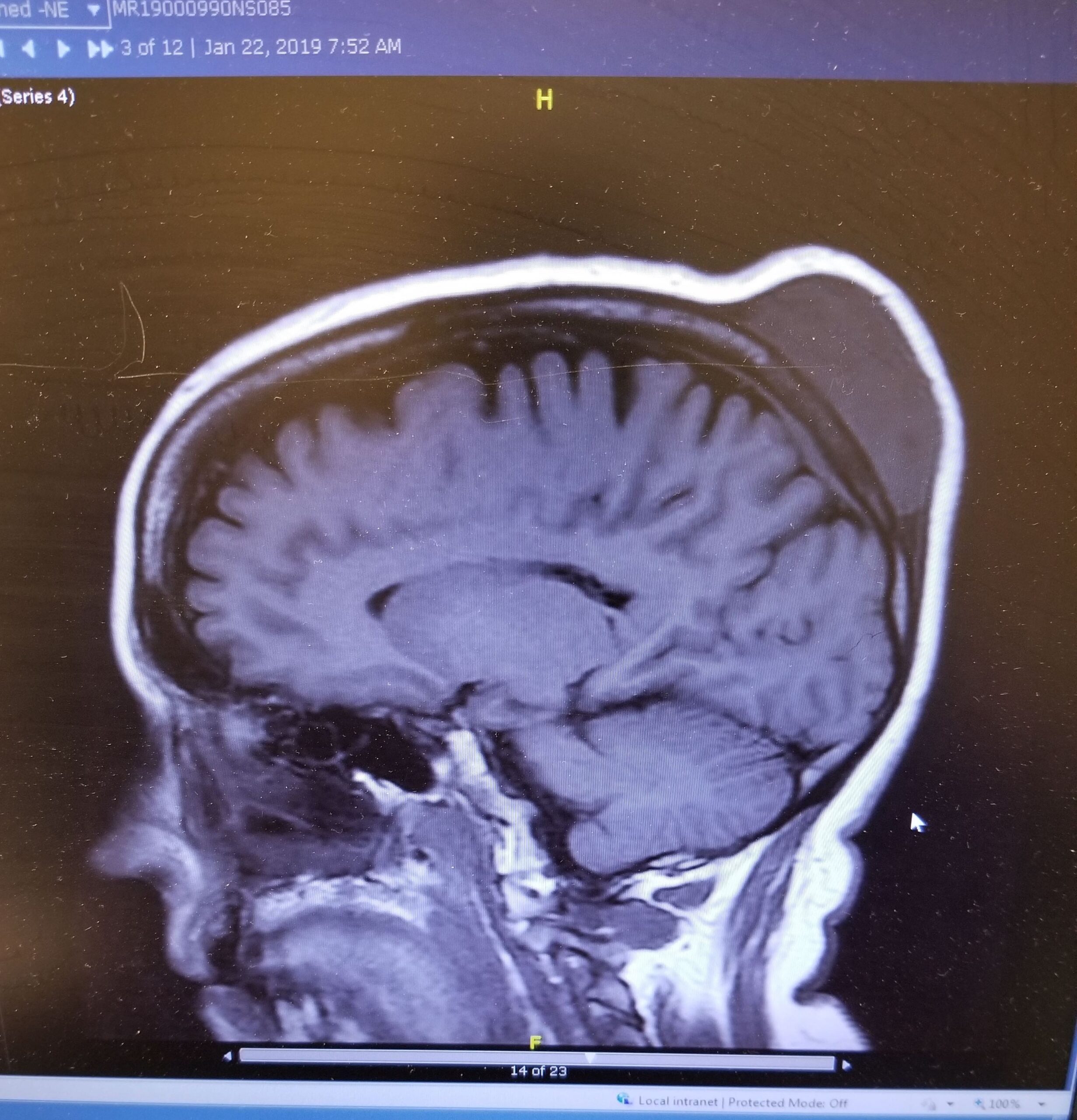 它长得非常快,在8个月的时间里,它从一片橙子或者小橘子那么大,变成了一个橙子那么大,在我的头皮外面有一个完整的橙子那么大。当我得到一些良好的医疗护理时,八个月后,它开始在我的头骨内形成在我的大脑外层,它已经穿过了我的头骨。这是一种非常严重的,非常罕见的。我一遍又一遍地听不同的医生说我的情况是多么罕见,一切都是多么反常。
