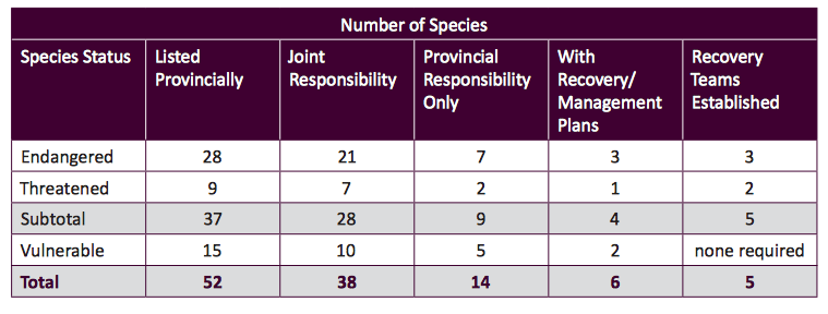 在新斯科舍省的37个风险物种中,28个是联邦政府的共同责任。问题和审核师范常的责任的责任与九个濒临灭绝的或威胁的物种,全省自然资源部(DNR)完全责任。观察到AG的报告: