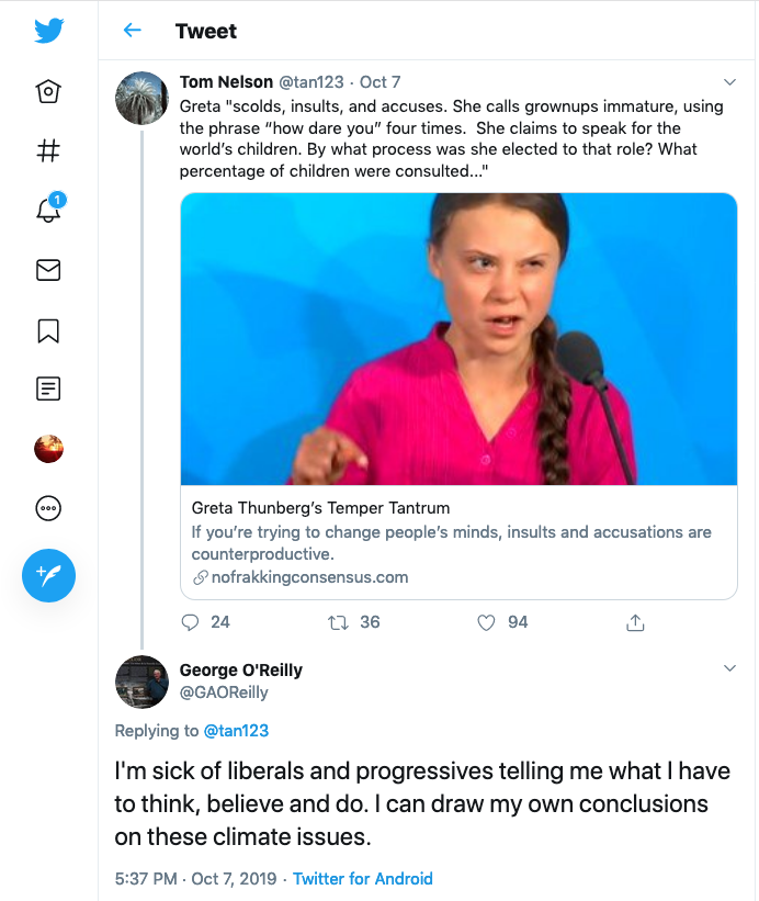 - George O 'Reilly是自然资源部的一名退休地质学家(地球科学和矿山分部在2018年搬到DEM之前是DNR的一部分),他也是“部长的提名”。(如果不是奥莱利发了几条挖苦我写作的推文,我是不会知道他在Twitter上这么活跃的,这让我看了看他的动态。这表明,他对格蕾塔·通伯格(Greta Thunberg)和“自由派和进步派”告诉他该如何看待气候变化的做法也很尖刻。他对“他妈的丑”的女人也不是很好。)