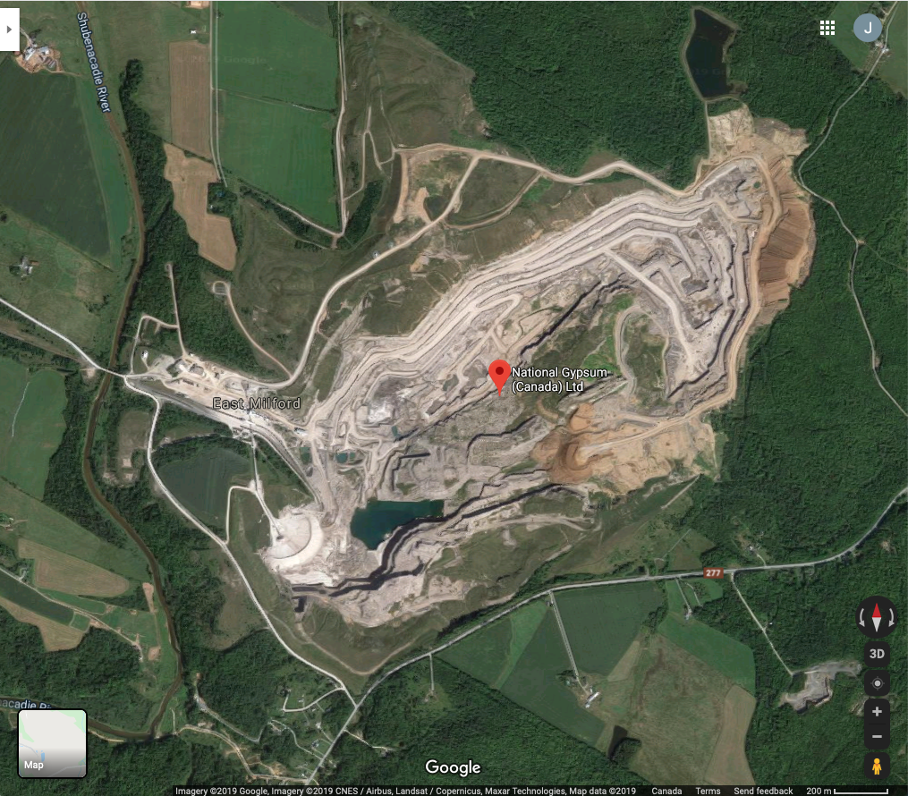 根据2018年的DNR报告,在新斯科舍,东米尔福德,只有一个活动的石膏采石场,已经运营了60年。它由美国一家私营公司国家石膏公司(National Gypsum)所有,是世界上最大的石膏采石场之一。它雇佣了65人,产生了40万美元的税收。
