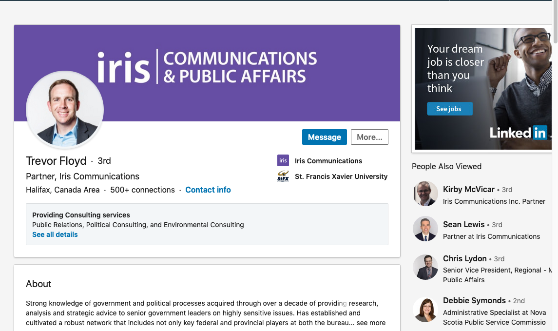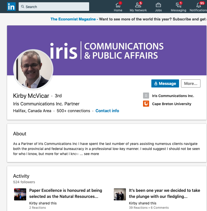 McVicar于2015年11月离开McNeil的公司,并声称在2015年11月创办了Iris Communications。(这其实不是真的——在2016年4月,他是在路易斯堡海鲜公司工作根据联合股票注册中心的数据,Iris Communications于2017年9月27日注册成立)。但关键是,他本可以在离开麦克尼尔的当月创办艾瑞斯通讯公司。新斯科舍省显然没有“冷静”期,高级政治人员可以跳进电话亭,以说客的身份出现。