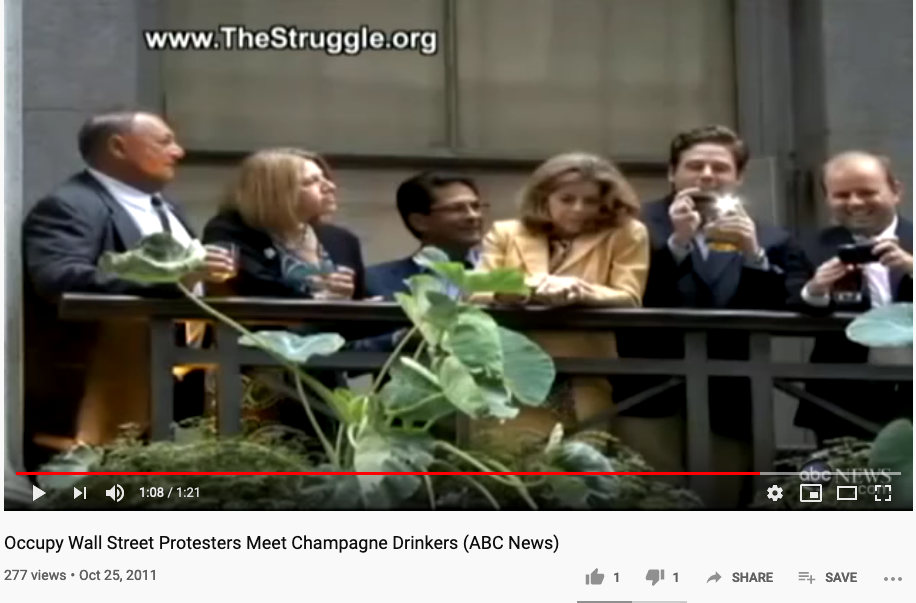 视频显示抗议者沿着华尔街游行,高呼金钱大亨,贪婪,和新自由主义制度,这导致了少数的人拥有世界上一半的财富。然后镜头向上移到一座豪华建筑的阳台上(白色的粗柱就是最明显的特征)。在那里,一群打扮时髦的人聚集在一起,喝着香槟,俯视着抗议者,给他们拍照,仿佛他们是动物园里的奇异生物。
