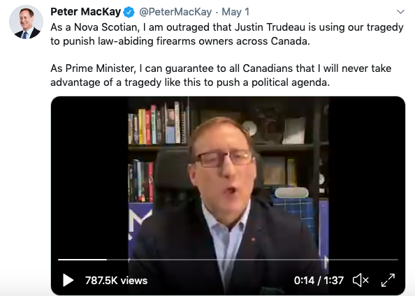 彼得·麦凯在推特上强烈反对枪支禁令。当他在2014年担任联邦司法部长时,他是拍摄穿着一件t恤,上面印有一半的加拿大枫叶,上面写着“绝不妥协”。