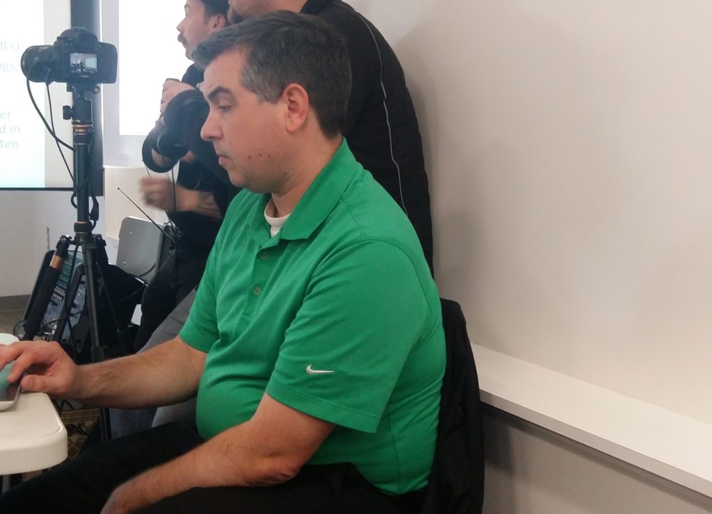 大西洋黄金通讯经理Dustin O'Leary违法的公共信息会议在Sherbroke,NS,2019年5月,约翰珀斯猛烈地被捕。照片:Joan Baxter