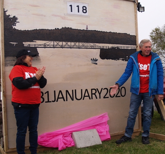 Rob Holten首席安德里亚·保罗揭示的礼物一块石头,他雕刻的关闭日期”一个'se 'K 2020年1月31日,在阅读总理麦克尼尔的开,他说他的承诺关闭船港是“石头雕成的,“但未能确认立法日期将被尊重。照片:Joan Baxter