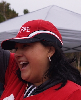皮克图登陆第一民族的莎拉·克拉克站在船港关闭钟前。图片:Joan Baxter