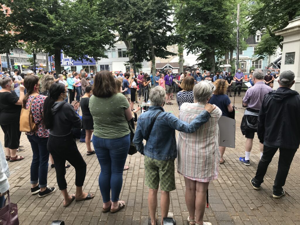 在周一中午的哈利法克斯在维多利亚公园聚集了大约200人,旨在提请注意对新斯科舍省大众杀戮的公众探究要求。