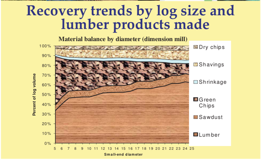 一个快速考虑的事实:(表面积)是一个“平方函数”,而体积是一个“立方函数”。简单的几何学规定,当树木变得更小时,它们必须产出更少(和更小)的木材,作为总的树木收获的一部分。伙计们,这是基础数学。木材产量主要是体积的函数,而木屑(工厂废料)主要是表面积的函数。根据定义,废弃物与木材的比率必须随着树木直径的减小而增加(显著),特别是在所引用图表中详细说明的阈值以下(7-8英寸以下)。否则就是否认事实。