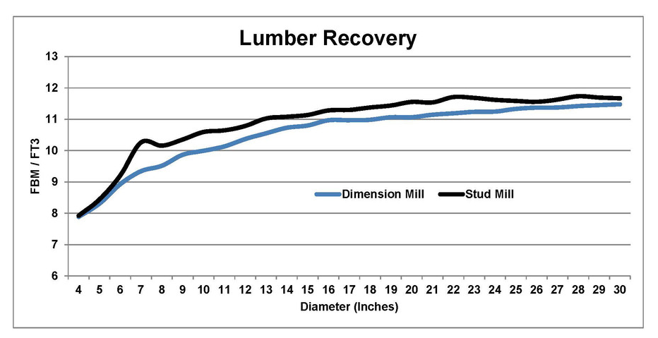 1951年的研究证实,为了确定直径对木材恢复的“真正影响”,除了直径以外的所有其他变量必须保持不变。当使用2300根有声音的直木头(没有腐烂或弯曲的木头)时,发现当直径从3英寸增加到16英寸时,木材回收率也分别从44%增加到60%。11