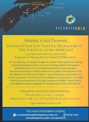 它已被标榜为在一个“非正式的信息发布会”,“尾矿坝和尾矿管理:大西洋黄金办法”,与三位专家谁是被带到从有关最佳实践的设计,施工和社区答案”的问题的“即大西洋黄金是‘致力于利用’,其提出的科克伦山金矿(你可以阅读有关尾矿管理设施运营在这里)。