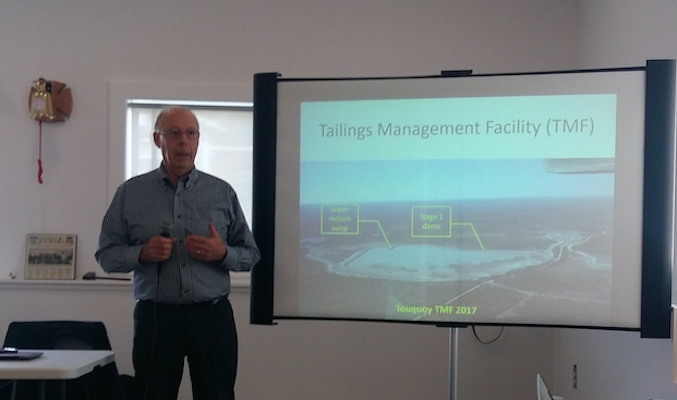 彼得·莱特托在他的幻灯片上展示了尾矿坝和蓄水池。照片:琼巴克斯特