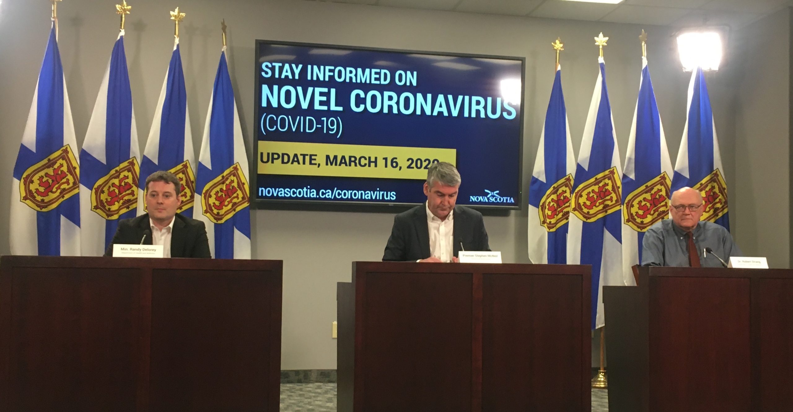 2020年3月16日新闻发布会上称为新斯科舍省地宣布两个新的Covid-19的情况。从左到右依次为:健康与福利部长兰迪·德洛里,总理斯蒂芬·麦克尼尔,首席医疗官罗伯特·斯特朗博士。图片:蒂姆·布斯凯/哈利法克斯考官