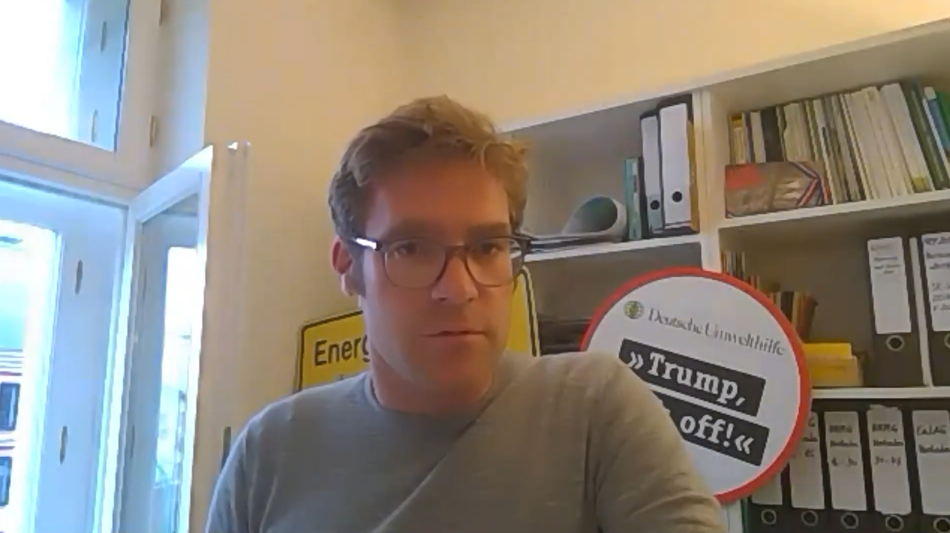 在活动中与活动人员说话10月8日网络研讨会,身后挂着“特朗普水力压裂取消”的牌子,Constantin Zerger.德国环保非政府组织Umwelthilfe的回应,呼应了媒体的报道,即特朗普一直在推动德国向压裂天然气敞开大门。他说,这意味着该国正在考虑三个液化天然气终端,这将阻碍德国的气候目标,并阻碍其能源转型,从化石燃料。
