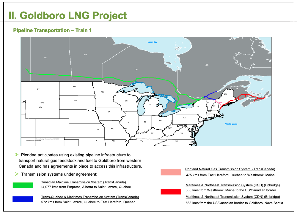 在2019年1月公司介绍Pieridae表示,他们已经“达成协议”进入加拿大西部和Goldboro之间现有的输油管道。