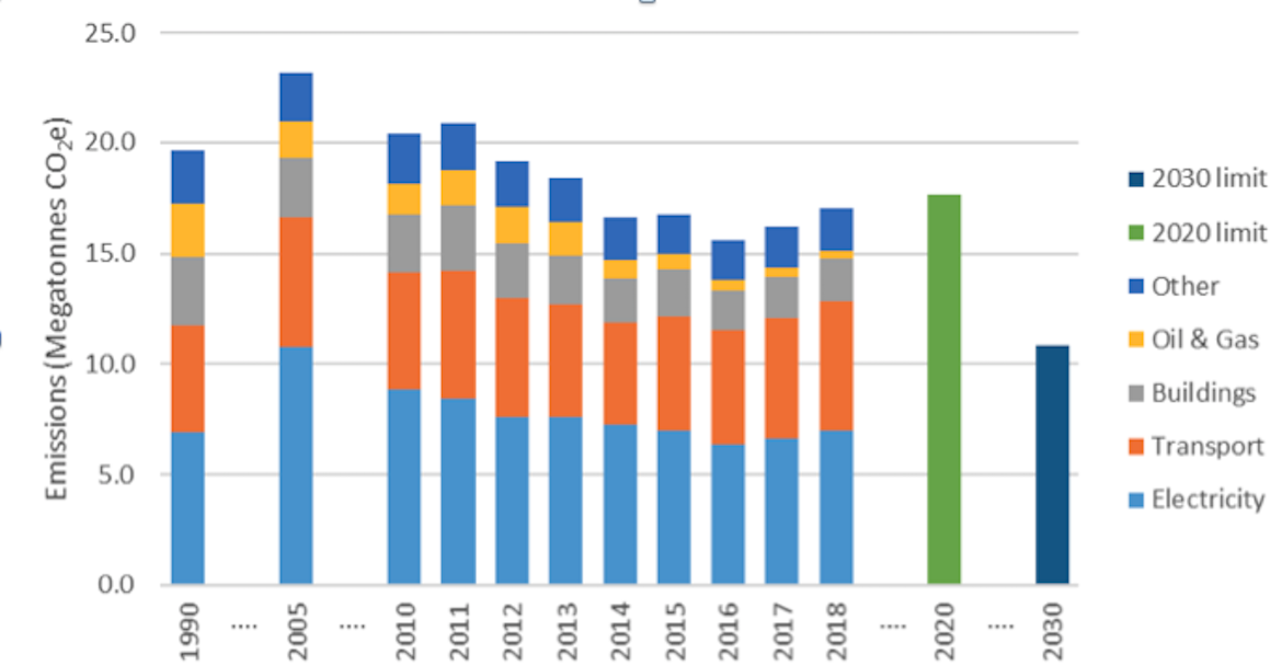 他列入了以下图表,该图表显示了Nova Scotia从环境和气候变化的主要发射器的温室气体排放水平加拿大2020年国家库存报告, 2020年和2030年的碳排放上限分别为10%和53%可持续发展目标法案。