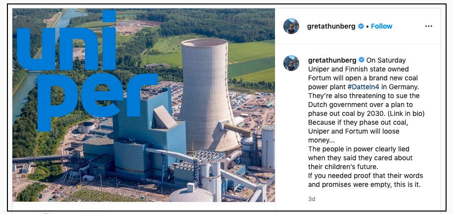 5月2020年5月,瑞典气候变化活动家Greta Thunberg批评了Instagram的疏浚,以防止煤炭。