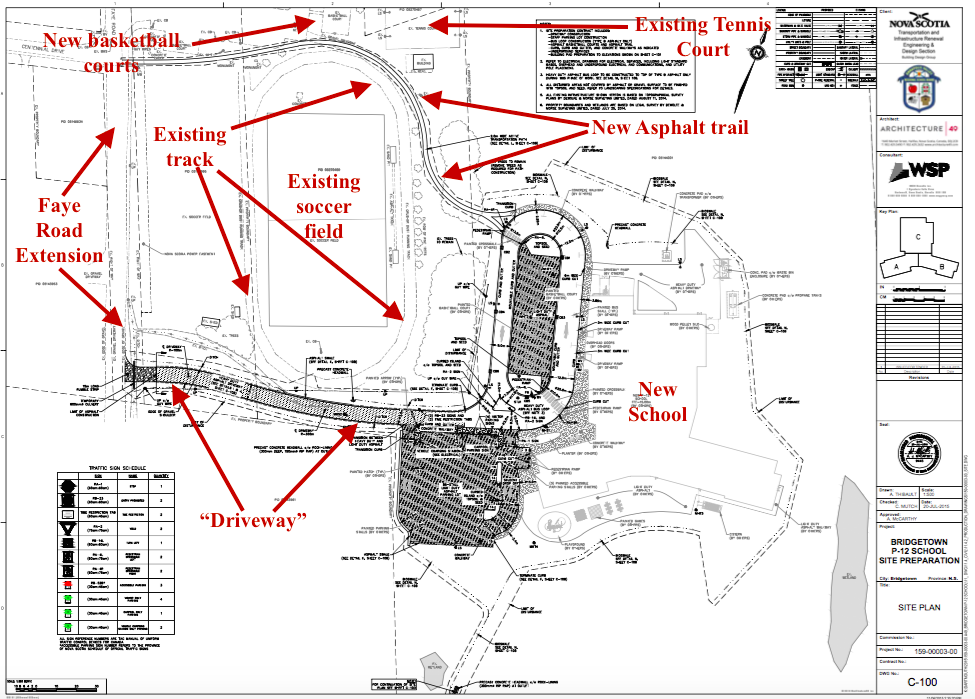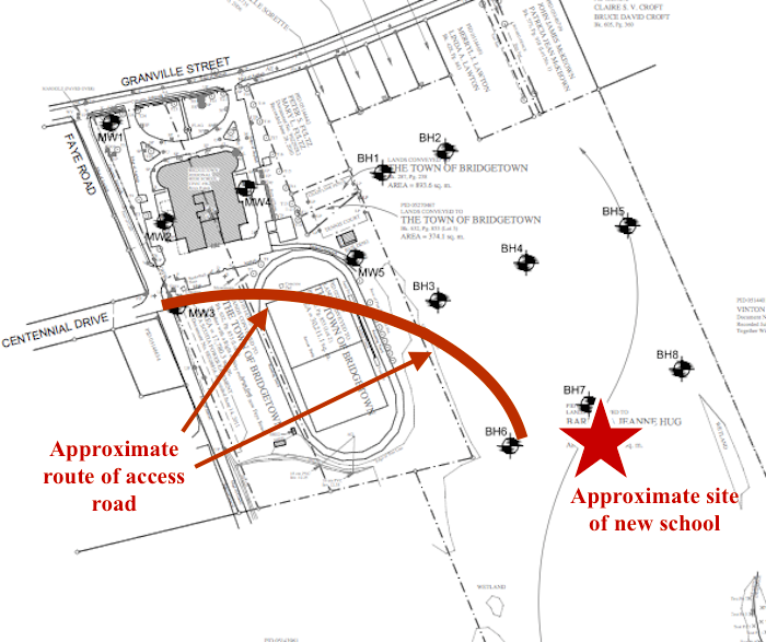 我一直无法找到任何公共文档显示的确切位置访问道路按原计划,但总理斯蒂芬·麦克尼尔和一位政府发言人证实,当新学校最初制定的计划,其中包括一个通路,从纪念路和法耶路的十字路口,穿过现有学校后面的操场,然后到达新学校的位置,大致是这样的: