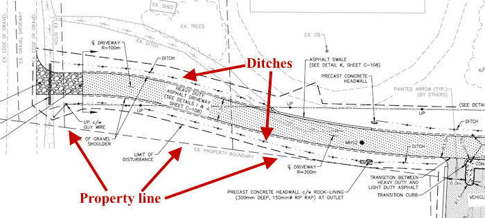 在这里我们看到,车道完全是在省级拥有的财产(如果只是刚刚以北的财产线),车道的两边有一条沟。