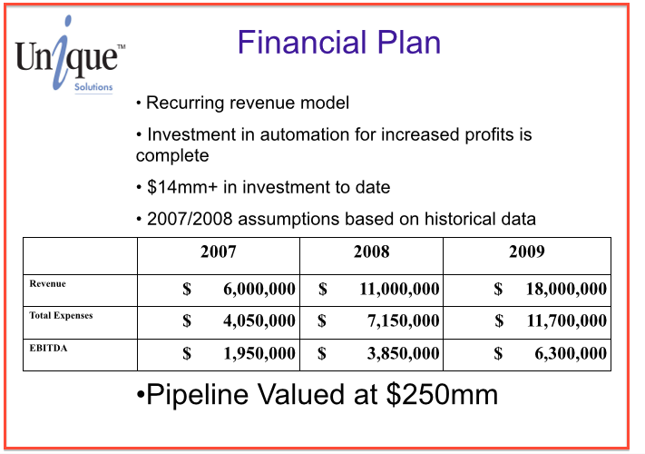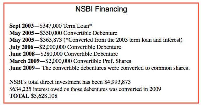 正如典型的当NSBI拥有公司潜在的股权股权时,NSBI在独特的解决方案董事会上获得了一个席位。一年后,2006年7月,NSBI以敞篷债券的形式再次投入了一个独特的解决方案,再次投入了一项酷炫的200万美元。2008年,另外280,000美元的可换股债券是2008年3月的第二百万美元。6月,所有金融工具都被转换为股票。