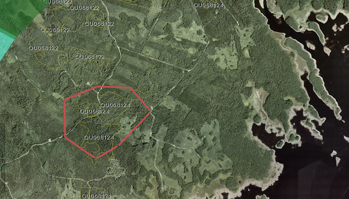 正如我所说的,黄色的轮廓多边形代表自2016年HPMV启动以来批准的收获计划。这里存在两个问题:首先,地图不完整,因为它不包括2016年之前批准的、但仍未执行的收成。其次,看看这些多边形是包括在内。其中大部分看起来仍是完整的森林。这是因为用于地图的航拍照片是旧的。