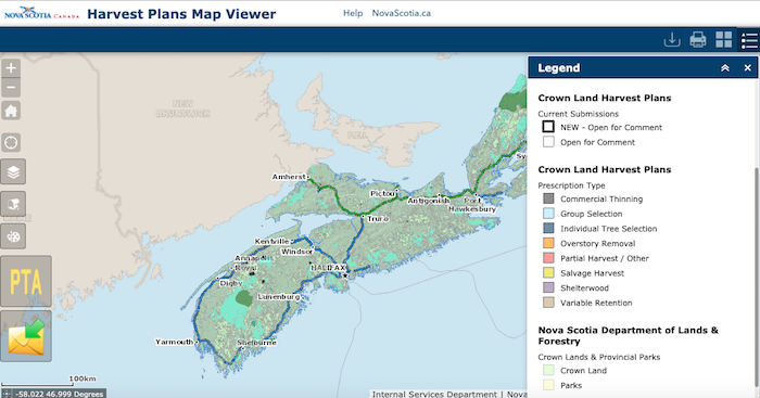 收获计划地图查看器的屏幕截图 - 目前唯一的官方意味着公众必须评论批准的森林收获。