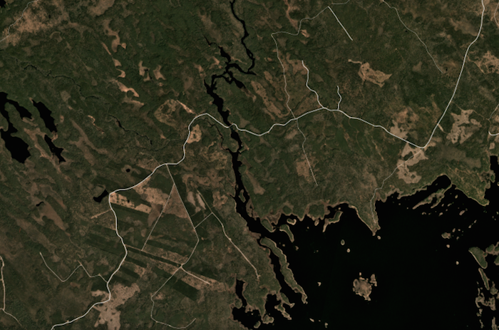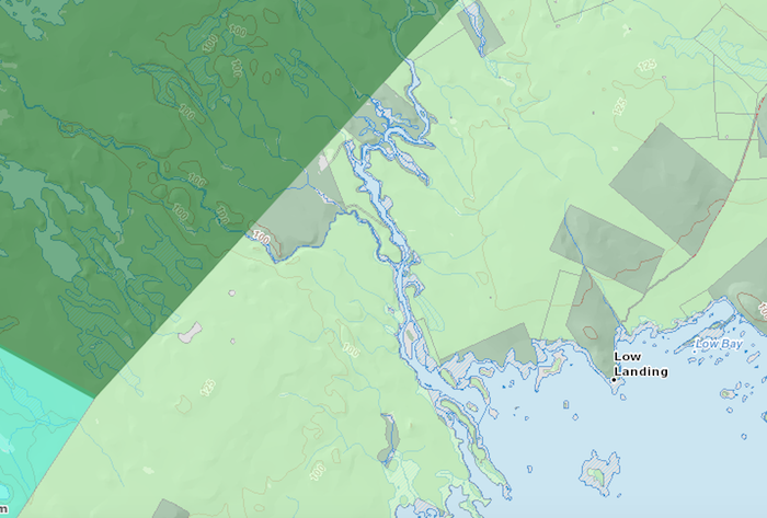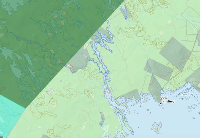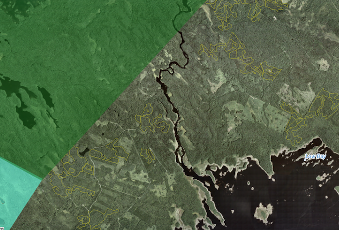 在下一个截图中,我关掉了名为“NS土地和林业部”的浅绿色层 - 这示出了皇冠陆地 - 因为它使得难以看到地面。然后我打开了从地图右侧的图例上方访问的“ns图像”图层。这提供了省卫星形象的看起来,但事实证明是空中照片。