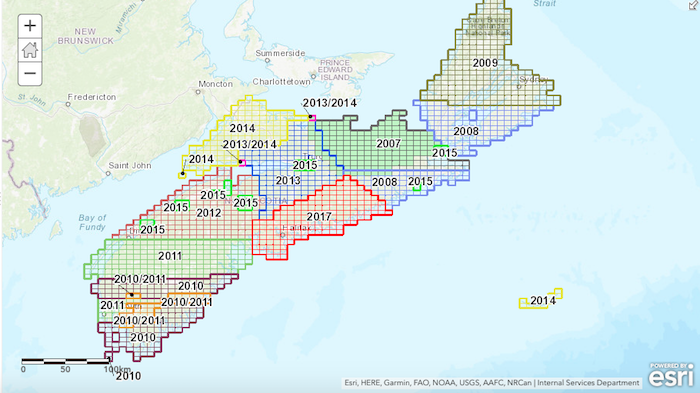 DLF的Jarrett告诉我,内部服务部门提供的“NS Imagery”层包含DNR / DLF和全省各种时间段的其他来源捕获的航拍照片。她发给我以下索引地图,显示照片的照片: